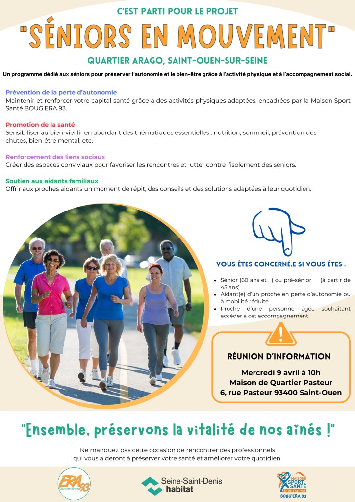 En partenariat avec le bailleur Seine-Saint-Denis habitat, notre association et sa Maison Sport Santé BOUG’ERA 93 invite les habitants du quartier Arago (Saint-Ouen-sur-Seine) à une réunion d’information sur le projet Séniors en Mouvement le 9 avril 2025 au sein de la Maison de Quartier Pasteur.